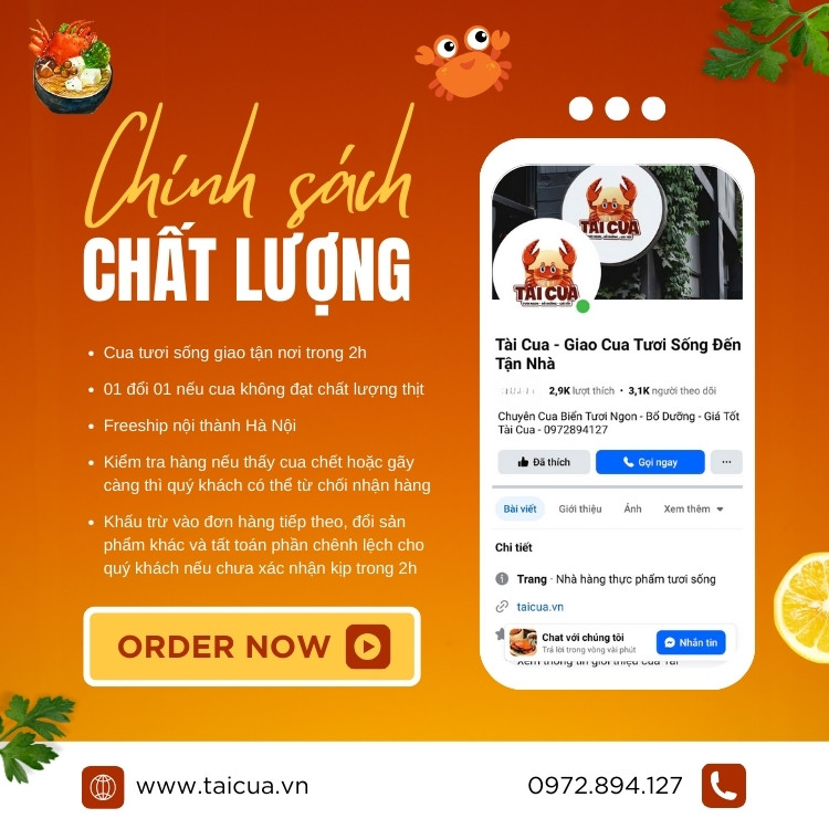 Nếu cua ốp < 80% thịt, Quý khách cần chụp lại đầy đủ bill mua hàng & hình 2 Càng Cua + Thân Cua bẻ đôi & hình số lượng con bị ốp. Sau đó gửi về Facebook Page TÀI CUA hoặc Zalo TÀI CUA để được chúng tôi căn cứ giải quyết nhanh chóng.